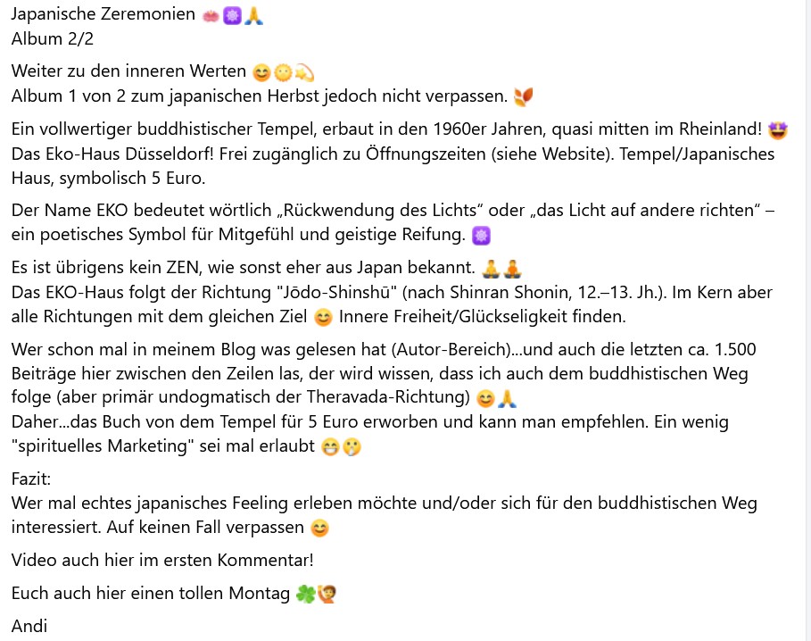 Du erklärst die Jōdo-Shinshū-Richtung sachlich, aber mit Herz. Die Balance zwischen Information und Erfahrung gelingt dir perfekt.