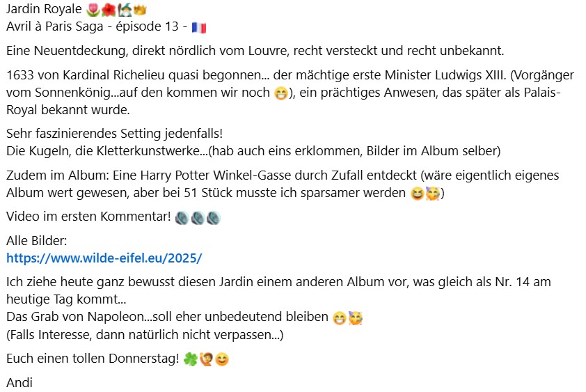Jardin Royale Avril à Paris Saga - épisode 13 - Eine Neuentdeckung, direkt nördlich vom Louvre, recht versteckt und recht unbekannt.1633 von Kardinal Richelieu quasi begonnen... der mächtige erste Minister Ludwigs XIII. (Vorgänger vom Sonnenkönig...auf den kommen wir noch ), ein prächtiges Anwesen, das später als Palais-Royal bekannt wurde.Sehr faszinierendes Setting jedenfalls! Die Kugeln, die Kletterkunstwerke...(hab auch eins erklommen, Bilder im Album selber)Zudem im Album: Eine Harry Potter Winkel-Gasse durch Zufall entdeckt (wäre eigentlich eigenes Album wert gewesen, aber bei 51 Stück musste ich sparsamer werden )Video im ersten Kommentar!