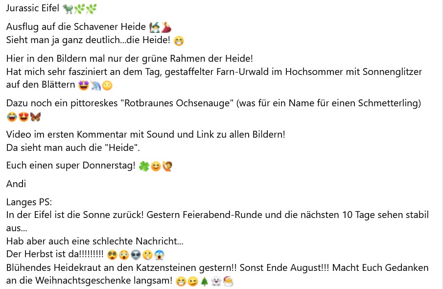 Jurassic Eifel Ausflug auf die Schavener Heide Sieht man ja ganz deutlich...die Heide! Hier in den Bildern mal nur der grüne Rahmen der Heide! Hat mich sehr fasziniert an dem Tag, gestaffelter Farn-Urwald im Hochsommer mit Sonnenglitzer auf den Blättern Dazu noch ein pittoreskes "Rotbraunes Ochsenauge" (was für ein Name für einen Schmetterling) Video im ersten Kommentar mit Sound und Link zu allen Bildern!Da sieht man auch die "Heide".Euch einen super Donnerstag! Andi