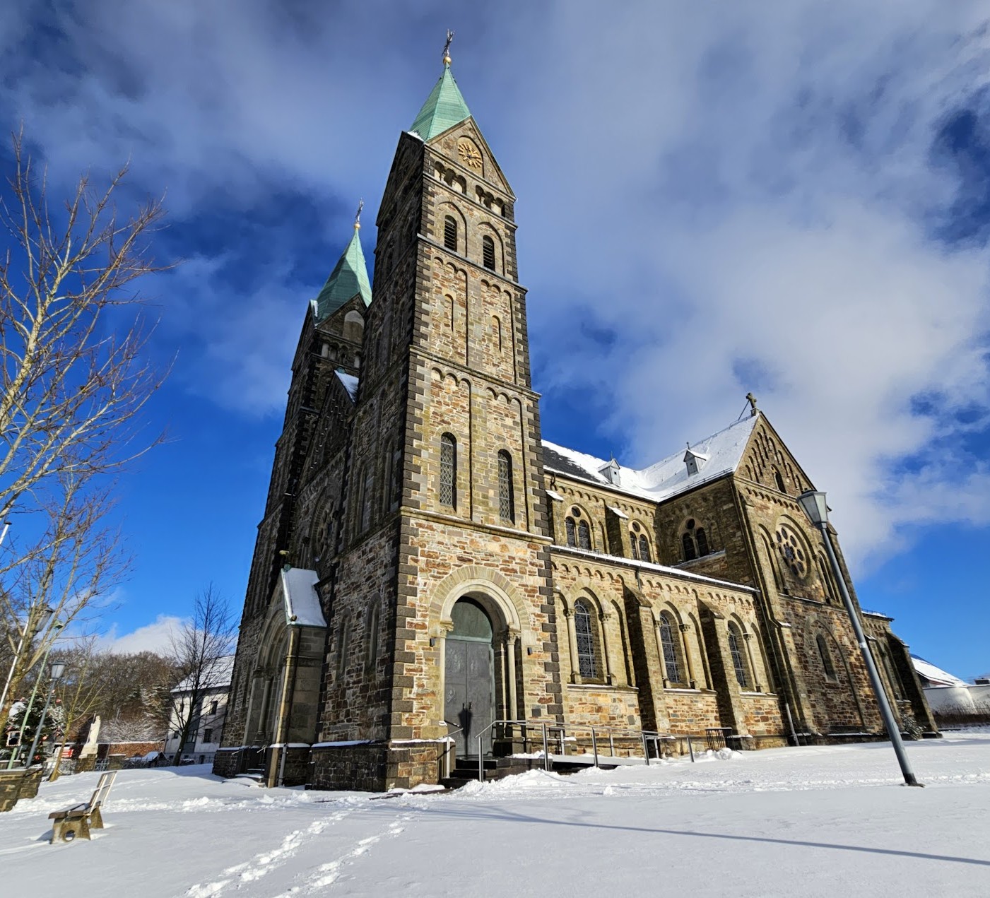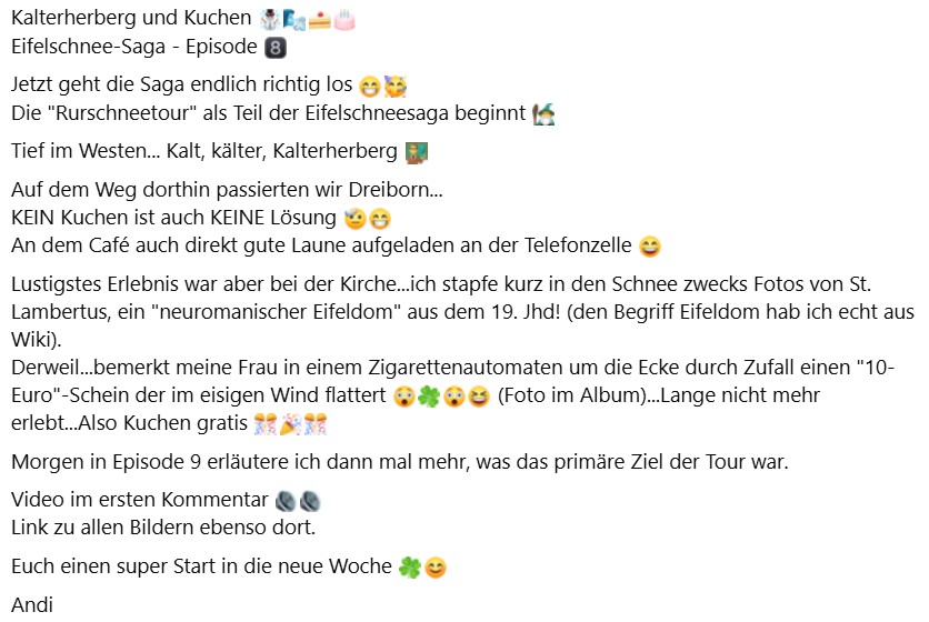 Kalterherberg und Kuchen Eifelschnee-Saga - Episode Jetzt geht die Saga endlich richtig los Die "Rurschneetour" als Teil der Eifelschneesaga beginnt Tief im Westen... Kalt, kälter, Kalterherberg Auf dem Weg dorthin passierten wir Dreiborn...KEIN Kuchen ist auch KEINE Lösung An dem Café auch direkt gute Laune aufgeladen an der Telefonzelle Lustigstes Erlebnis war aber bei der Kirche...ich stapfe kurz in den Schnee zwecks Fotos von St. Lambertus, ein "neuromanischer Eifeldom" aus dem 19. Jhd! (den Begriff Eifeldom hab ich echt aus Wiki).Derweil...bemerkt meine Frau in einem Zigarettenautomaten um die Ecke durch Zufall einen "10-Euro"-Schein der im eisigen Wind flattert (Foto im Album)...Lange nicht mehr erlebt...Also Kuchen gratis Morgen in Episode 9 erläutere ich dann mal mehr, was das primäre Ziel der Tour war.
