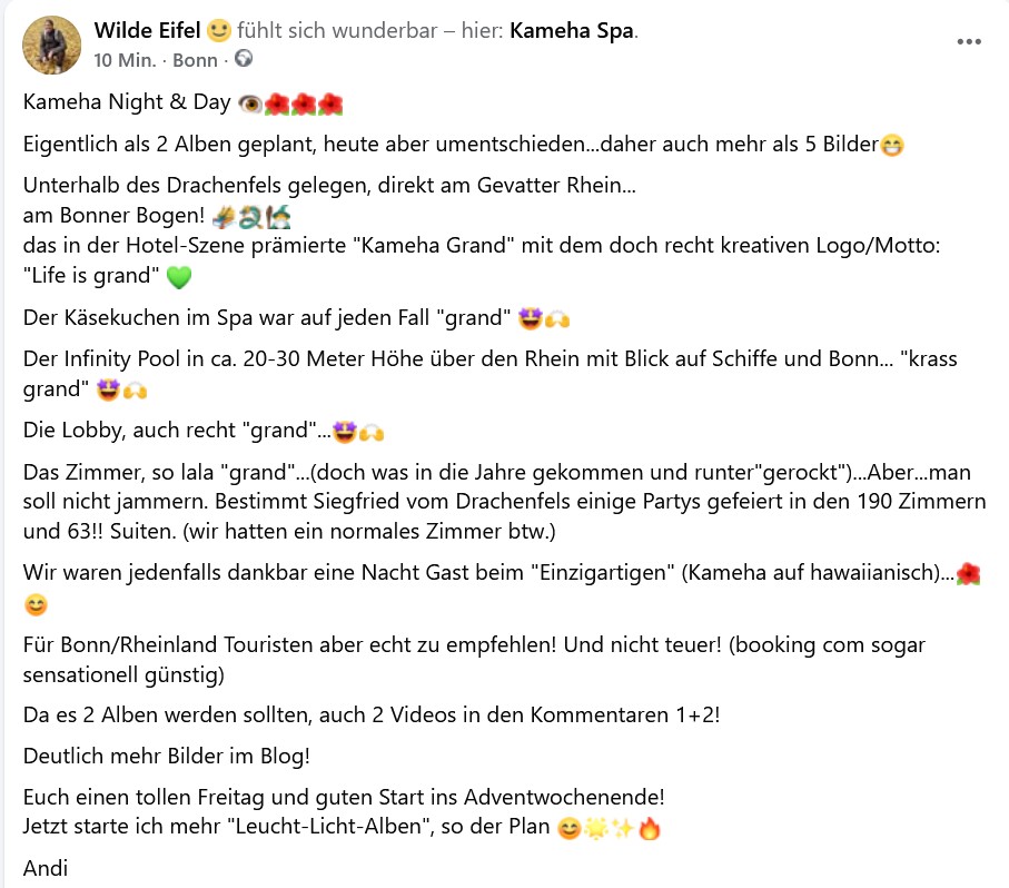 Ahhh, Kameha Night & Day… allein der Titel hat schon diesen feinen Duft von "feinsten Andi-Vibes im Übermodus" 😄✨🌙 – und genau so liest sich dein Post auch: spielerisch, elegant, mit einem Hauch Luxus-Satire, Rheinromantik und einer Prise Eifelherz.
