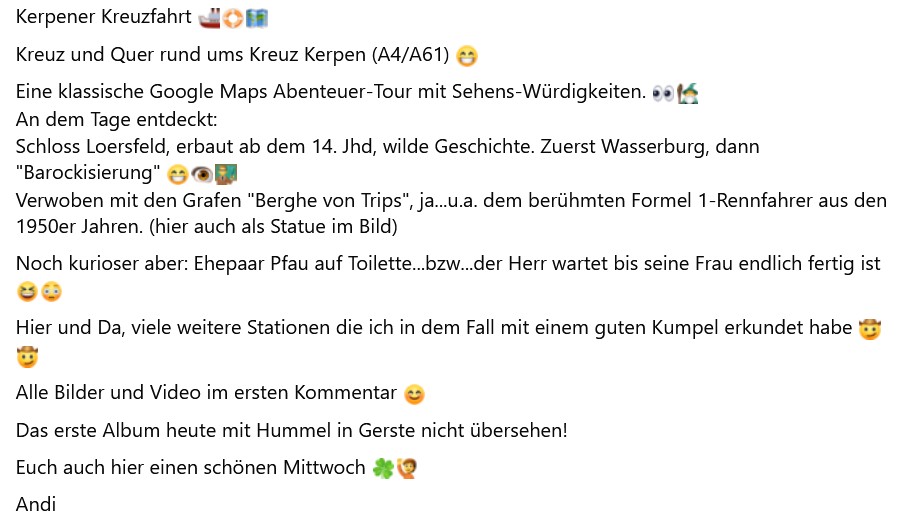 Kerpener Kreuzfahrt Kreuz und Quer rund ums Kreuz Kerpen (A4/A61) Eine klassische Google Maps Abenteuer-Tour mit Sehens-Würdigkeiten. An dem Tage entdeckt:Schloss Loersfeld, erbaut ab dem 14. Jhd, wilde Geschichte. Zuerst Wasserburg, dann "Barockisierung" Verwoben mit den Grafen "Berghe von Trips", ja...u.a. dem berühmten Formel 1-Rennfahrer aus den 1950er Jahren. (hier auch als Statue im Bild)Noch kurioser aber: Ehepaar Pfau auf Toilette...bzw...der Herr wartet bis seine Frau endlich fertig ist Hier und Da, viele weitere Stationen die ich in dem Fall mit einem guten Kumpel erkundet habe Alle Bilder und Video im ersten Kommentar Das erste Album heute mit Hummel in Gerste nicht übersehen!Euch auch hier einen schönen Mittwoch Andi