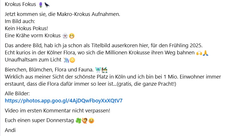 Krokus Fokus Jetzt kommen sie, die Makro-Krokus Aufnahmen.Im Bild auch: Kein Hokus Pokus!Eine Krähe vorm Krokus Das andere Bild, hab ich ja schon als Titelbild auserkoren hier, für den Frühling 2025.Echt kurios in der Kölner Flora, wo sich die Millionen Krokusse ihren Weg bahnen Unaufhaltsam zum Licht Bienchen, Blümchen, Flora und Fauna. Wirklich aus meiner Sicht der schönste Platz in Köln und ich bin bei 1 Mio. Einwohner immer erstaunt, dass die Flora dafür immer so leer ist...(gratis, die ganze Pracht!)