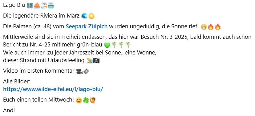 Lago Blu Die legendäre Riviera im März Die Palmen (ca. 48) vom Seepark Zülpich wurden ungeduldig, die Sonne rief! Mittlerweile sind sie in Freiheit entlassen, das hier war Besuch Nr. 3-2025, bald kommt auch schon Bericht zu Nr. 4-25 mit mehr grün-blau Wie auch immer, zu jeder Jahreszeit bei Sonne...eine Wonne,dieser Strand mit Urlaubsfeeling