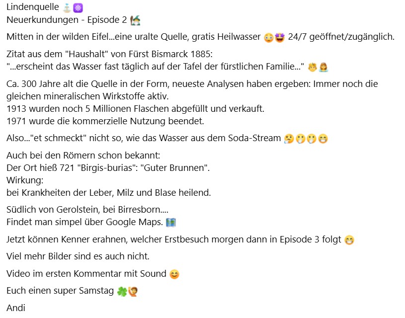 Lindenquelle Neuerkundungen - Episode 2 Mitten in der wilden Eifel...eine uralte Quelle, gratis Heilwasser 24/7 geöffnet/zugänglich.Zitat aus dem "Haushalt" von Fürst Bismarck 1885:"...erscheint das Wasser fast täglich auf der Tafel der fürstlichen Familie..." Ca. 300 Jahre alt die Quelle in der Form, neueste Analysen haben ergeben: Immer noch die gleichen mineralischen Wirkstoffe aktiv.1913 wurden noch 5 Millionen Flaschen abgefüllt und verkauft.1971 wurde die kommerzielle Nutzung beendet.Also..."et schmeckt" nicht so, wie das Wasser aus dem Soda-Stream Auch bei den Römern schon bekannt:Der Ort hieß 721 "Birgis-burias": "Guter Brunnen".Wirkung:bei Krankheiten der Leber, Milz und Blase heilend.Südlich von Gerolstein, bei Birresborn....Findet man simpel über Google Maps. Jetzt können Kenner erahnen, welcher Erstbesuch morgen dann in Episode 3 folgt Viel mehr Bilder sind es auch nicht.Video im ersten Kommentar mit Sound Euch einen super Samstag