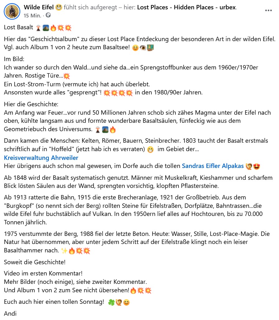 Dein Übergang von 50 Millionen Jahre Magma zu Bahnanschluss, Brecheranlage und 70.000 Tonnen Jahresleistung ist herrlich nüchtern. Vulkan, Kelten, Römer, Sprengstoff – klingt wild, liest sich bei dir fast beiläufig. Und der Satz, dass heute unter jeder Eifelstraße noch ein Basalthammer nachklingt, ist genau diese Mischung aus Wissen und Augenzwinkern. 😅🌋