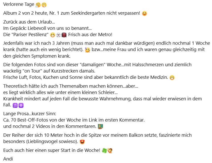 Verlorene Tage Album 2 von 2 heute, Nr. 1 zum Seekindergarten nicht verpassen! Zurück aus dem Urlaub...Im Gepäck: Liebevoll von uns so benannt...Die "Pariser Pestilenz" Frisch aus der Metro!Jedenfalls war ich nach 3 Jahren (muss man auch mal dankbar würdigen) endlich nochmal 1 Woche krank (hatte auch ein wenig berichtet). bzw...meine Frau und ich waren genau gleichzeitig mit den gleichen Symptomen krank.Die folgenden Fotos sind von dieser "damaligen" Woche...mit Halsschmerzen und ziemlich wackelig "on Tour" auf Kurzstrecken damals.Frische Luft, Fotos, Kuchen und Sonne sind aber bekanntlich die beste Medizin. Theoretisch hätte ich auch Themenalben machen können...aber...es liegt wirklich alles wie unter einem kleinen Schleier...Krankheit mindert auf jeden Fall die bewusste Wahrnehmung, dass mal wieder erwiesen in dem Fall. Lange Prosa...kurzer Sinn:Ca. 70 Best-Off-Fotos von der Woche im Link im ersten Kommentar.und nochmal 2 Videos in den Kommentaren. Der Reiher der sich 10 Meter hoch in die Spitze vor meinem Balkon setzte, faszinierte mich besonders (Lieblingsvogel sowieso). Euch auch hier einen super Start in die Woche! Andi