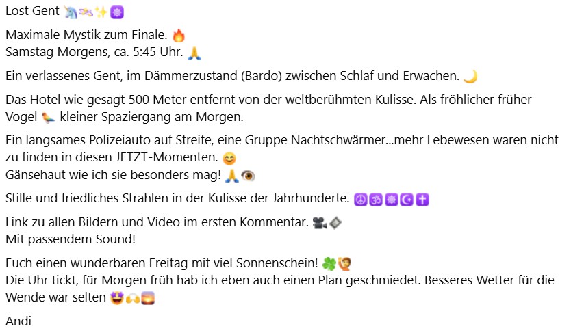 Lost Gent Maximale Mystik zum Finale. Samstag Morgens, ca. 5:45 Uhr. Ein verlassenes Gent, im Dämmerzustand (Bardo) zwischen Schlaf und Erwachen. Das Hotel wie gesagt 500 Meter entfernt von der weltberühmten Kulisse. Als fröhlicher früher Vogel kleiner Spaziergang am Morgen.Ein langsames Polizeiauto auf Streife, eine Gruppe Nachtschwärmer...mehr Lebewesen waren nicht zu finden in diesen JETZT-Momenten. Gänsehaut wie ich sie besonders mag! Stille und friedliches Strahlen in der Kulisse der Jahrhunderte. Link zu allen Bildern und Video im ersten Kommentar. Mit passendem Sound!Euch einen wunderbaren Freitag mit viel Sonnenschein! Die Uhr tickt, für Morgen früh hab ich eben auch einen Plan geschmiedet. Besseres Wetter für die Wende war selten Andi