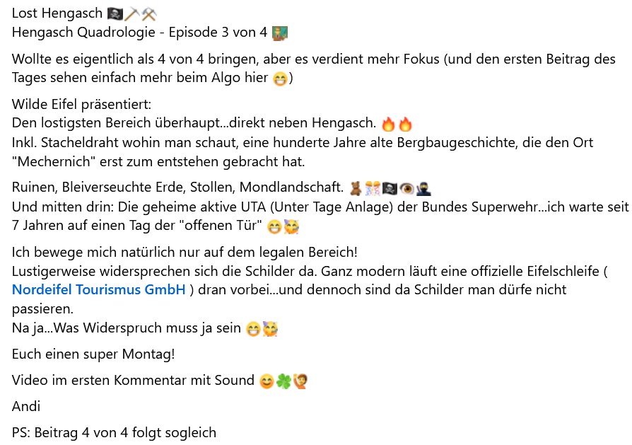 Lost Hengasch Hengasch Quadrologie - Episode 3 von 4 Wollte es eigentlich als 4 von 4 bringen, aber es verdient mehr Fokus (und den ersten Beitrag des Tages sehen einfach mehr beim Algo hier )Wilde Eifel präsentiert:Den lostigsten Bereich überhaupt...direkt neben Hengasch. Inkl. Stacheldraht wohin man schaut, eine hunderte Jahre alte Bergbaugeschichte, die den Ort "Mechernich" erst zum entstehen gebracht hat.Ruinen, Bleiverseuchte Erde, Stollen, Mondlandschaft. Und mitten drin: Die geheime aktive UTA (Unter Tage Anlage) der Bundes Superwehr...ich warte seit 7 Jahren auf einen Tag der "offenen Tür" Ich bewege mich natürlich nur auf dem legalen Bereich!Lustigerweise widersprechen sich die Schilder da. Ganz modern läuft eine offizielle Eifelschleife ( Nordeifel Tourismus GmbH ) dran vorbei...und dennoch sind da Schilder man dürfe nicht passieren.Na ja...Was Widerspruch muss ja sein Euch einen super Montag!Video im ersten Kommentar mit Sound Andi