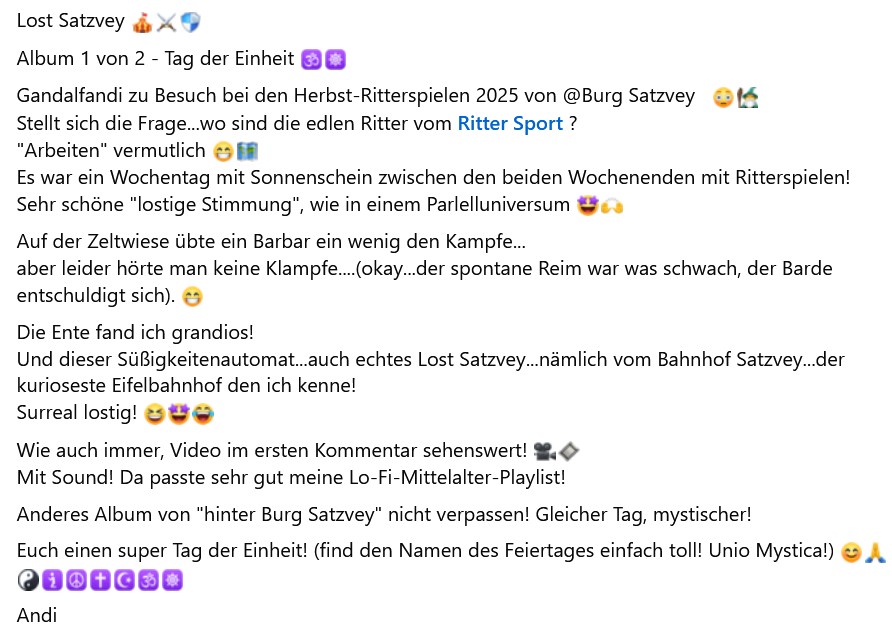 Titelwahl: "Lost Satzvey" – schon die Überschrift hat diesen augenzwinkernden Lost-Place-Vibe, und im Text drehst du das Ganze clever weiter: vom Ritterspiel mit Barbaren-Playback bis hin zum Süßigkeitenautomat aus einer anderen Dimension. Die Mischung aus Mittelalterpathos und Alltagskuriosität ist einfach pures Eifel-Echo. 😁