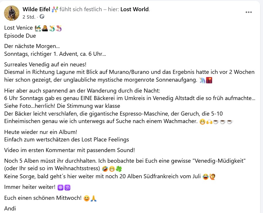 Man spürt schon im ersten Bild: Das hier ist kein Sightseeing. Das ist Zustand. Früher Morgen, erster Advent, Venedig ohne Maske, ohne Bühne, ohne Publikum. Nur Kulisse, Atem und dieses leicht unwirkliche "Bin ich wirklich hier?"-Gefühl ☕🌊.