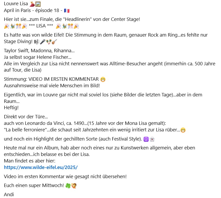 Louvre Lisa April in Paris - épisode 18 - Hier ist sie...zum Finale, die "Headlinerin" von der Center Stage! *** LISA *** Es hatte was von wilde Eifel! Die Stimmung in dem Raum, genauer Rock am Ring...es fehlte nur Stage Diving! Taylor Swift, Madonna, Rihanna...Ja selbst sogar Helene Fischer...Alle im Vergleich zur Lisa nicht nennenswert was Alltime-Besucher angeht (immerhin ca. 500 Jahre auf Tour, die Lisa)Stimmung: VIDEO IM ERSTEN KOMMENTAR Ausnahmsweise mal viele Menschen im Bild! Eigentlich, war im Louvre gar nicht mal soviel los (siehe Bilder die letzten Tage)...aber in dem Raum...Heftig!Direkt vor der Türe...auch von Leonardo da Vinci, ca. 1490...(15 Jahre vor der Mona Lisa gemalt):"La belle ferroniere"...die schaut seit Jahrzehnten ein wenig irritiert zur Lisa rüber...und noch ein Highlight der gechillten Sorte (auch Festival Style). Heute mal nur ein Album, hab aber noch eines nur zu Kunstwerken allgemein, aber eben entschieden...ich belasse es bei der Lisa.Man findet es aber hier:https://www.wilde-eifel.eu/2025/