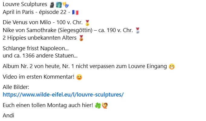 Louvre Sculptures April in Paris - épisode 22 - Die Venus von Milo - 100 v. Chr. Nike von Samothrake (Siegesgöttin) – ca. 190 v. Chr. 2 Hippies unbekannten Alters Schlange frisst Napoleon...und ca. 1366 andere Statuen...Album Nr. 2 von heute, Nr. 1 nicht verpassen zum Louvre Eingang Video im ersten Kommentar!