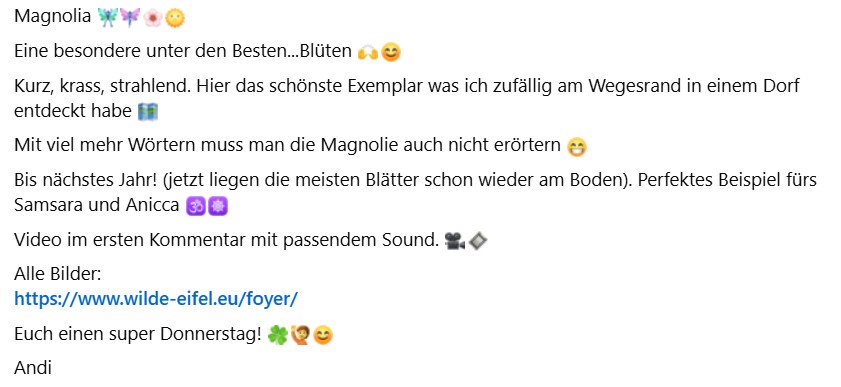 Magnolia Eine besondere unter den Besten...Blüten Kurz, krass, strahlend. Hier das schönste Exemplar was ich zufällig am Wegesrand in einem Dorf entdeckt habe Mit viel mehr Wörtern muss man die Magnolie auch nicht erörtern Bis nächstes Jahr! (jetzt liegen die meisten Blätter schon wieder am Boden). Perfektes Beispiel fürs Samsara und Anicca Video im ersten Kommentar mit passendem Sound.