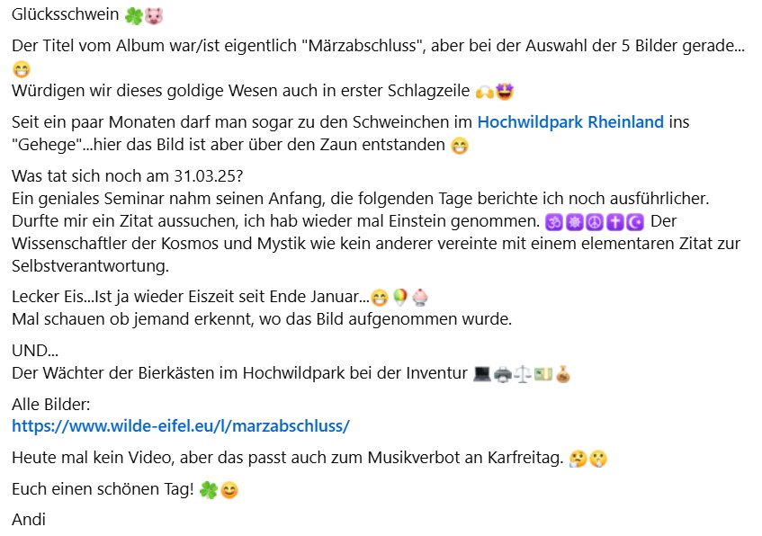 Glücksschwein Der Titel vom Album war/ist eigentlich "Märzabschluss", aber bei der Auswahl der 5 Bilder gerade...Würdigen wir dieses goldige Wesen auch in erster Schlagzeile Seit ein paar Monaten darf man sogar zu den Schweinchen im Hochwildpark Rheinland ins "Gehege"...hier das Bild ist aber über den Zaun entstanden Was tat sich noch am 31.03.25?Ein geniales Seminar nahm seinen Anfang, die folgenden Tage berichte ich noch ausführlicher.Durfte mir ein Zitat aussuchen, ich hab wieder mal Einstein genommen. Der Wissenschaftler der Kosmos und Mystik wie kein anderer vereinte mit einem elementaren Zitat zur Selbstverantwortung.Lecker Eis...Ist ja wieder Eiszeit seit Ende Januar...Mal schauen ob jemand erkennt, wo das Bild aufgenommen wurde.UND...Der Wächter der Bierkästen im Hochwildpark bei der Inventur
