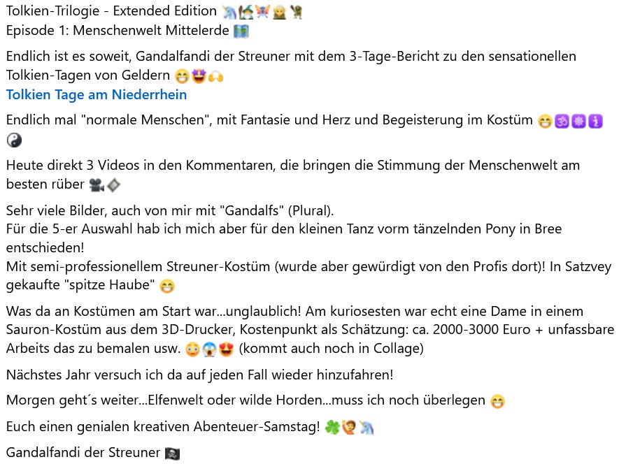 Tolkien-Trilogie - Extended Edition Episode 1: Menschenwelt Mittelerde Endlich ist es soweit, Gandalfandi der Streuner mit dem 3-Tage-Bericht zu den sensationellen Tolkien-Tagen von Geldern Tolkien Tage am NiederrheinEndlich mal "normale Menschen", mit Fantasie und Herz und Begeisterung im Kostüm Heute direkt 3 Videos in den Kommentaren, die bringen die Stimmung der Menschenwelt am besten rüber Sehr viele Bilder, auch von mir mit "Gandalfs" (Plural).Für die 5-er Auswahl hab ich mich aber für den kleinen Tanz vorm tänzelnden Pony in Bree entschieden!Mit semi-professionellem Streuner-Kostüm (wurde aber gewürdigt von den Profis dort)! In Satzvey gekaufte "spitze Haube" Was da an Kostümen am Start war...unglaublich! Am kuriosesten war echt eine Dame in einem Sauron-Kostüm aus dem 3D-Drucker, Kostenpunkt als Schätzung: ca. 2000-3000 Euro + unfassbare Arbeits das zu bemalen usw. (kommt auch noch in Collage)Nächstes Jahr versuch ich da auf jeden Fall wieder hinzufahren!Morgen geht´s weiter...Elfenwelt oder wilde Horden...muss ich noch überlegen Euch einen genialen kreativen Abenteuer-Samstag! Gandalfandi der Streuner