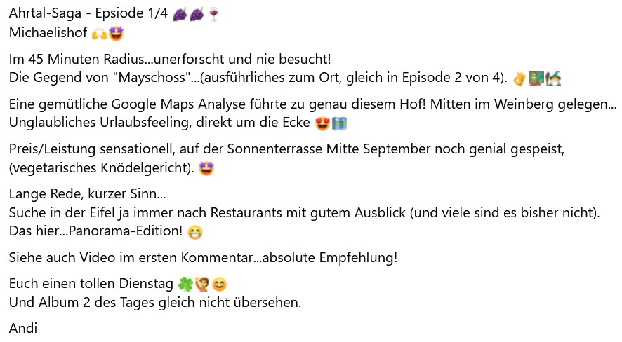 Erzählung: Schön, wie du die Google-Maps-Spurensuche einbaust. Das wirkt echt, spontan, nicht inszeniert: einfach mal klicken – und plötzlich landet man mitten im Weinberg, mit Terrasse und Panoramablick. Genau so funktioniert Abenteuer im Alltag.