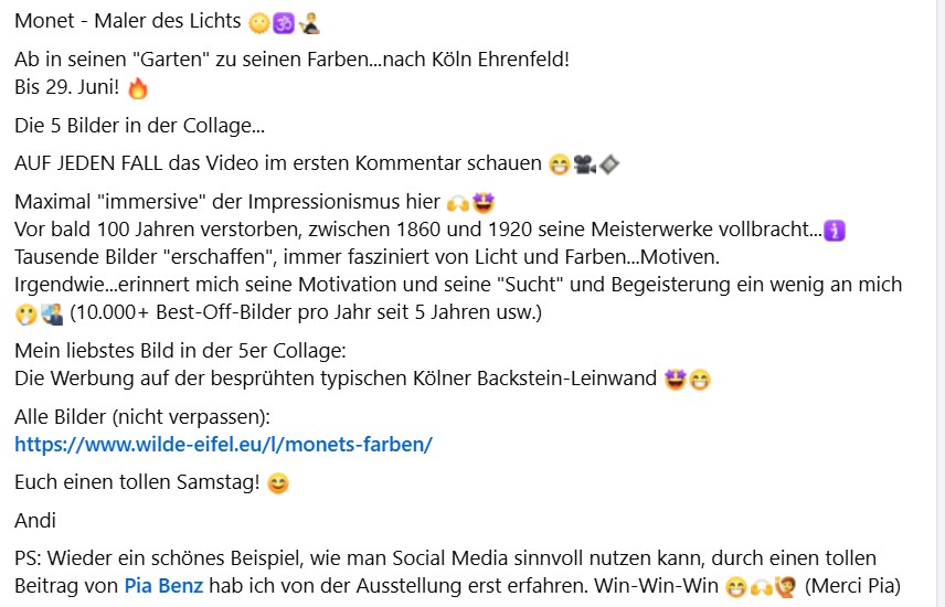 Monet - Maler des Lichts Ab in seinen "Garten" zu seinen Farben...nach Köln Ehrenfeld! Bis 29. Juni! Die 5 Bilder in der Collage...AUF JEDEN FALL das Video im ersten Kommentar schauen Maximal "immersive" der Impressionismus hier Vor bald 100 Jahren verstorben, zwischen 1860 und 1920 seine Meisterwerke vollbracht...Tausende Bilder "erschaffen", immer fasziniert von Licht und Farben...Motiven.Irgendwie...erinnert mich seine Motivation und seine "Sucht" und Begeisterung ein wenig an mich (10.000+ Best-Off-Bilder pro Jahr seit 5 Jahren usw.)Mein liebstes Bild in der 5er Collage:Die Werbung auf der besprühten typischen Kölner Backstein-Leinwand