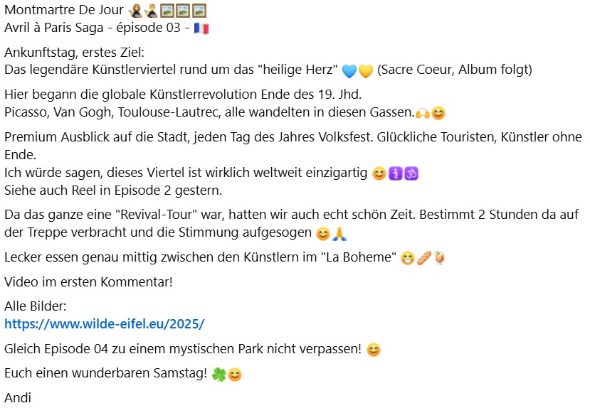 Montmartre De Jour Avril à Paris Saga - épisode 03 - Ankunftstag, erstes Ziel:Das legendäre Künstlerviertel rund um das "heilige Herz" (Sacre Coeur, Album folgt)Hier begann die globale Künstlerrevolution Ende des 19. Jhd.Picasso, Van Gogh, Toulouse-Lautrec, alle wandelten in diesen Gassen.Premium Ausblick auf die Stadt, jeden Tag des Jahres Volksfest. Glückliche Touristen, Künstler ohne Ende.Ich würde sagen, dieses Viertel ist wirklich weltweit einzigartig Siehe auch Reel in Episode 2 gestern.Da das ganze eine "Revival-Tour" war, hatten wir auch echt schön Zeit. Bestimmt 2 Stunden da auf der Treppe verbracht und die Stimmung aufgesogen Lecker essen genau mittig zwischen den Künstlern im "La Boheme"