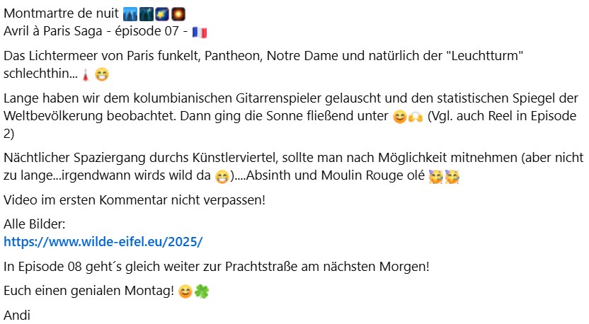 Montmartre de nuit Avril à Paris Saga - épisode 07 - Das Lichtermeer von Paris funkelt, Pantheon, Notre Dame und natürlich der "Leuchtturm" schlechthin...Lange haben wir dem kolumbianischen Gitarrenspieler gelauscht und den statistischen Spiegel der Weltbevölkerung beobachtet. Dann ging die Sonne fließend unter (Vgl. auch Reel in Episode 2)Nächtlicher Spaziergang durchs Künstlerviertel, sollte man nach Möglichkeit mitnehmen (aber nicht zu lange...irgendwann wirds wild da )....Absinth und Moulin Rouge olé Video im ersten Kommentar nicht verpassen!