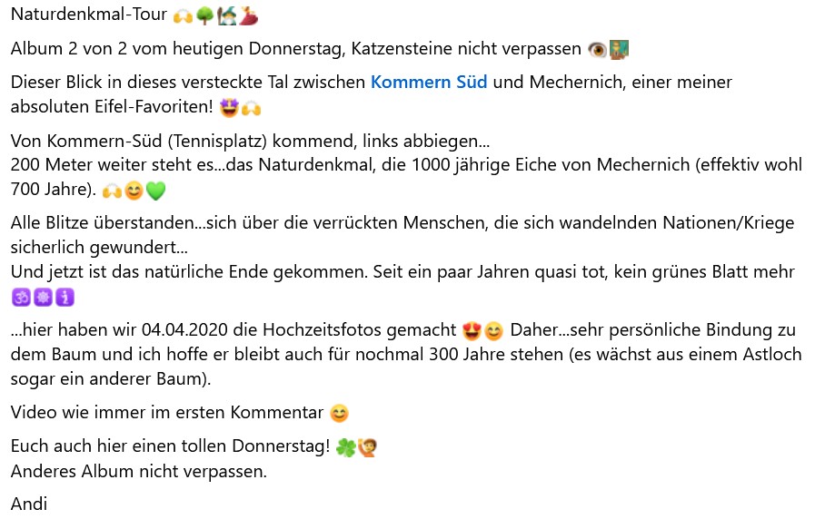 Ein Beitrag, der zeigt, wie Natur, Erinnerung und Humor zusammenfließen können. Man liest ihn und denkt: Ja, auch ein toter Baum kann Geschichten erzählen – von Jahrhunderten, von Hochzeitsmomenten und von einer Eifel, die nie ihren Zauber verliert. 🌿✨