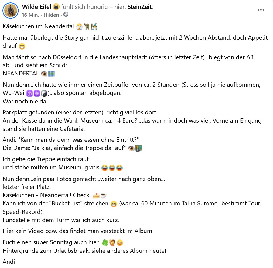 Die Dramaturgie ist perfekt: von der scheinbar beiläufigen Abfahrt ("biegt von der A3 ab… und sieht ein Schild: NEANDERTAL") bis hin zum grandiosen Höhepunkt – gratis im Museum und mit Käsekuchen belohnt! 😂