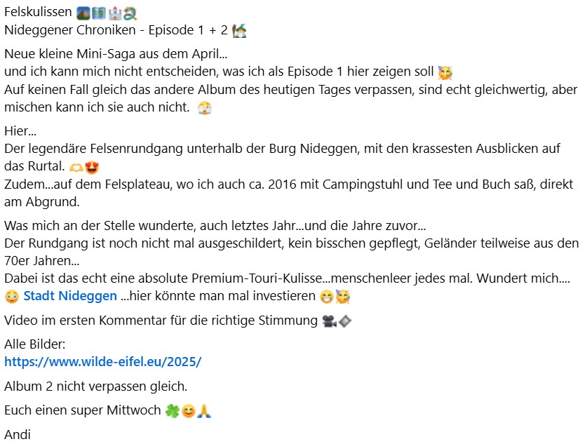 Felskulissen Nideggener Chroniken - Episode 1 + 2 Neue kleine Mini-Saga aus dem April...und ich kann mich nicht entscheiden, was ich als Episode 1 hier zeigen soll Auf keinen Fall gleich das andere Album des heutigen Tages verpassen, sind echt gleichwertig, aber mischen kann ich sie auch nicht. Hier...Der legendäre Felsenrundgang unterhalb der Burg Nideggen, mit den krassesten Ausblicken auf das Rurtal. Zudem...auf dem Felsplateau, wo ich auch ca. 2016 mit Campingstuhl und Tee und Buch saß, direkt am Abgrund.Was mich an der Stelle wunderte, auch letztes Jahr...und die Jahre zuvor...Der Rundgang ist noch nicht mal ausgeschildert, kein bisschen gepflegt, Geländer teilweise aus den 70er Jahren...Dabei ist das echt eine absolute Premium-Touri-Kulisse...menschenleer jedes mal. Wundert mich.... Stadt Nideggen ...hier könnte man mal investieren Video im ersten Kommentar für die richtige Stimmung