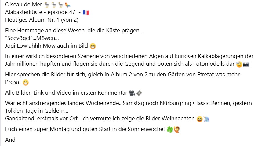 Oiseau de Mer Alabasterküste - épisode 47 - Heutiges Album Nr. 1 (von 2) Eine Hommage an diese Wesen, die die Küste prägen..."Seevögel"...Möwen...Jogi Löw ähhh Möw auch im Bild In einer wirklich besonderen Szenerie von verschiedenen Algen auf kuriosen Kalkablagerungen der Jahrmillionen hüpften und flogen sie durch die Gegend und boten sich als Fotomodells dar Hier sprechen die Bilder für sich, gleich in Album 2 von 2 zu den Gärten von Etretat was mehr Prosa! Alle Bilder, Link und Video im ersten Kommentar War echt anstrengendes langes Wochenende...Samstag noch Nürburgring Classic Rennen, gestern Tolkien-Tage in Geldern...Gandalfandi erstmals vor Ort...ich vermute ich zeige die Bilder Weihnachten Euch einen super Montag und guten Start in die Sonnenwoche! Andi