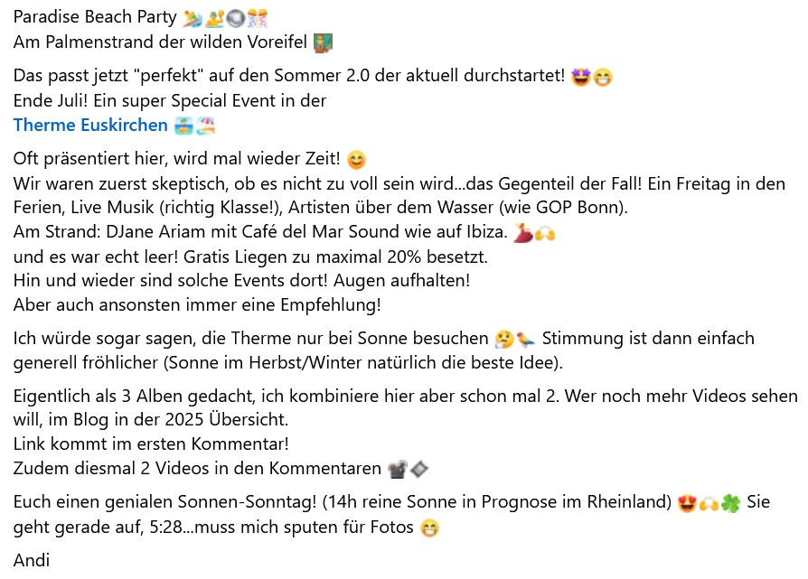 Paradise Beach Party Am Palmenstrand der wilden Voreifel Das passt jetzt "perfekt" auf den Sommer 2.0 der aktuell durchstartet! Ende Juli! Ein super Special Event in der Therme Euskirchen Oft präsentiert hier, wird mal wieder Zeit! Wir waren zuerst skeptisch, ob es nicht zu voll sein wird...das Gegenteil der Fall! Ein Freitag in den Ferien, Live Musik (richtig Klasse!), Artisten über dem Wasser (wie GOP Bonn).Am Strand: DJane Ariam mit Café del Mar Sound wie auf Ibiza. und es war echt leer! Gratis Liegen zu maximal 20% besetzt.Hin und wieder sind solche Events dort! Augen aufhalten! Aber auch ansonsten immer eine Empfehlung! Ich würde sogar sagen, die Therme nur bei Sonne besuchen Stimmung ist dann einfach generell fröhlicher (Sonne im Herbst/Winter natürlich die beste Idee).Eigentlich als 3 Alben gedacht, ich kombiniere hier aber schon mal 2. Wer noch mehr Videos sehen will, im Blog in der 2025 Übersicht.Link kommt im ersten Kommentar!Zudem diesmal 2 Videos in den Kommentaren Euch einen genialen Sonnen-Sonntag! (14h reine Sonne in Prognose im Rheinland) Sie geht gerade auf, 5:28...muss mich sputen für Fotos Andi