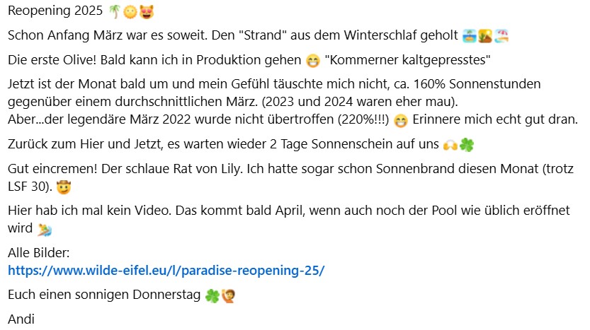 Reopening 2025 Schon Anfang März war es soweit. Den "Strand" aus dem Winterschlaf geholt Die erste Olive! Bald kann ich in Produktion gehen "Kommerner kaltgepresstes"Jetzt ist der Monat bald um und mein Gefühl täuschte mich nicht, ca. 160% Sonnenstunden gegenüber einem durchschnittlichen März. (2023 und 2024 waren eher mau).Aber...der legendäre März 2022 wurde nicht übertroffen (220%!!!) Erinnere mich echt gut dran.Zurück zum Hier und Jetzt, es warten wieder 2 Tage Sonnenschein auf uns Gut eincremen! Der schlaue Rat von Lily. Ich hatte sogar schon Sonnenbrand diesen Monat (trotz LSF 30). Hier hab ich mal kein Video. Das kommt bald April, wenn auch noch der Pool wie üblich eröffnet wird