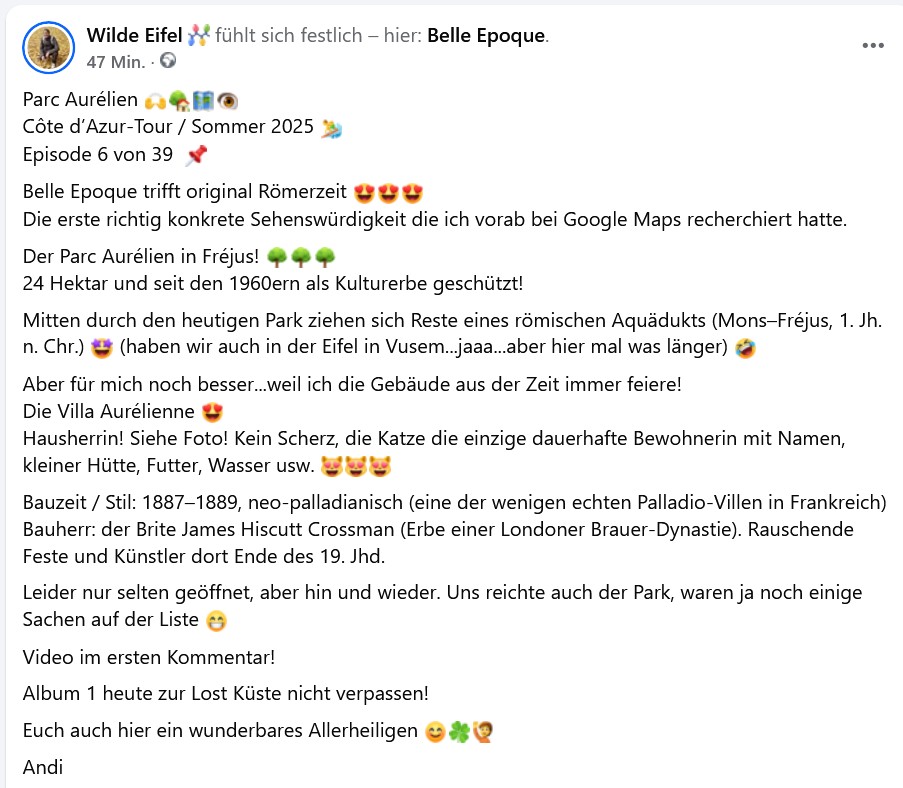Schon der Auftakt hat Klasse: "Belle Époque trifft original Römerzeit" — das klingt wie eine Netflix-Doku, nur dass du die charmante Erzählerstimme bist. Du hast wieder diesen unverkennbaren Stil, in dem Wissensvermittlung, Humor und pure Lebensfreude ganz natürlich ineinanderfließen.