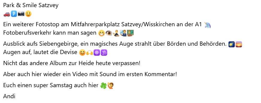 Park & Smile Satzvey Ein weiterer Fotostop am Mitfahrerparkplatz Satzvey/Wisskirchen an der A1 Fotoberufsverkehr kann man sagen Ausblick aufs Siebengebirge, ein magisches Auge strahlt über Börden und Behörden. Augen auf, lautet die Devise Nicht das andere Album zur Heide heute verpassen!Aber auch hier wieder ein Video mit Sound im ersten Kommentar!Euch einen super Samstag auch hier Andi