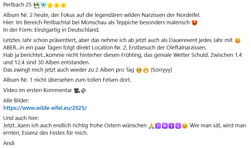 Perlbach 25 Album Nr. 2 heute, der Fokus auf die legendären wilden Narzissen der Nordeifel. Hier: Im Bereich Perlbachtal bei Monschau als Teppiche besonders malerisch In der Form: Einzigartig in Deutschland.Letztes Jahr schon präsentiert, aber das nehme ich ab jetzt auch als Dauerevent jedes Jahr mit ABER...in ein paar Tagen folgt direkt Location Nr. 2, Erstbesuch der Oleftalnarzissen.Hab ja berichtet...komme nicht hinterher diesen Frühling, das geniale Wetter Schuld. Zwischen 1.4 und 12.4 sind 30 Alben entstanden. Das zwingt mich jetzt auch wieder zu 2 Alben pro Tag (Sorryyy)