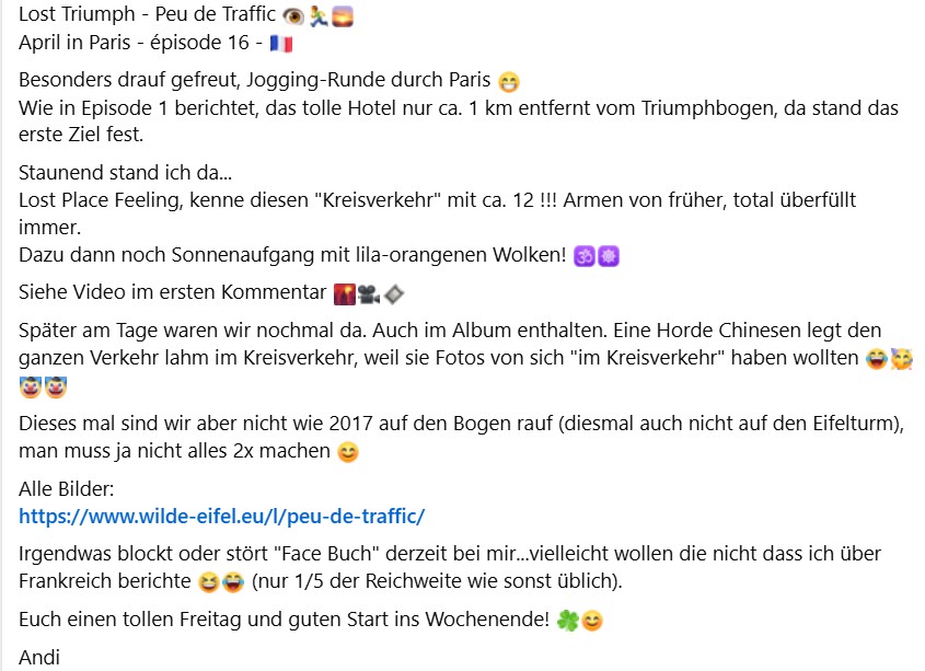 Lost Triumph - Peu de Traffic April in Paris - épisode 16 - Besonders drauf gefreut, Jogging-Runde durch Paris Wie in Episode 1 berichtet, das tolle Hotel nur ca. 1 km entfernt vom Triumphbogen, da stand das erste Ziel fest.Staunend stand ich da...Lost Place Feeling, kenne diesen "Kreisverkehr" mit ca. 12 !!! Armen von früher, total überfüllt immer. Dazu dann noch Sonnenaufgang mit lila-orangenen Wolken! Siehe Video im ersten Kommentar Später am Tage waren wir nochmal da. Auch im Album enthalten. Eine Horde Chinesen legt den ganzen Verkehr lahm im Kreisverkehr, weil sie Fotos von sich "im Kreisverkehr" haben wollten Dieses mal sind wir aber nicht wie 2017 auf den Bogen rauf (diesmal auch nicht auf den Eifelturm), man muss ja nicht alles 2x machen