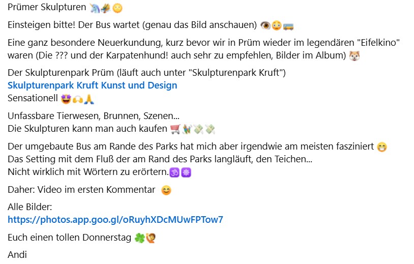 Prümer Skulpturen Einsteigen bitte! Der Bus wartet (genau das Bild anschauen) Eine ganz besondere Neuerkundung, kurz bevor wir in Prüm wieder im legendären "Eifelkino" waren (Die ??? und der Karpatenhund! auch sehr zu empfehlen, Bilder im Album) Der Skulpturenpark Prüm (läuft auch unter "Skulpturenpark Kruft")Skulpturenpark Kruft Kunst und DesignSensationell Unfassbare Tierwesen, Brunnen, Szenen...Die Skulpturen kann man auch kaufen Der umgebaute Bus am Rande des Parks hat mich aber irgendwie am meisten fasziniert Das Setting mit dem Fluß der am Rand des Parks langläuft, den Teichen...Nicht wirklich mit Wörtern zu erörtern.