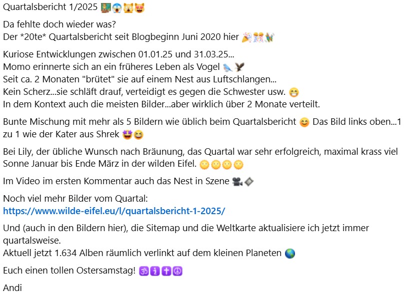 Quartalsbericht 1/2025 Da fehlte doch wieder was?Der *20te* Quartalsbericht seit Blogbeginn Juni 2020 hier Kuriose Entwicklungen zwischen 01.01.25 und 31.03.25...Momo erinnerte sich an ein früheres Leben als Vogel Seit ca. 2 Monaten "brütet" sie auf einem Nest aus Luftschlangen...Kein Scherz...sie schläft drauf, verteidigt es gegen die Schwester usw. In dem Kontext auch die meisten Bilder...aber wirklich über 2 Monate verteilt.Bunte Mischung mit mehr als 5 Bildern wie üblich beim Quartalsbericht Das Bild links oben...1 zu 1 wie der Kater aus Shrek Bei Lily, der übliche Wunsch nach Bräunung, das Quartal war sehr erfolgreich, maximal krass viel Sonne Januar bis Ende März in der wilden Eifel. Im Video im ersten Kommentar auch das Nest in Szene Noch viel mehr Bilder vom Quartal:https://www.wilde-eifel.eu/l/quartalsbericht-1-2025/Und (auch in den Bildern hier), die Sitemap und die Weltkarte aktualisiere ich jetzt immer quartalsweise.Aktuell jetzt 1.634 Alben räumlich verlinkt auf dem kleinen Planeten Euch einen tollen Ostersamstag! Andi