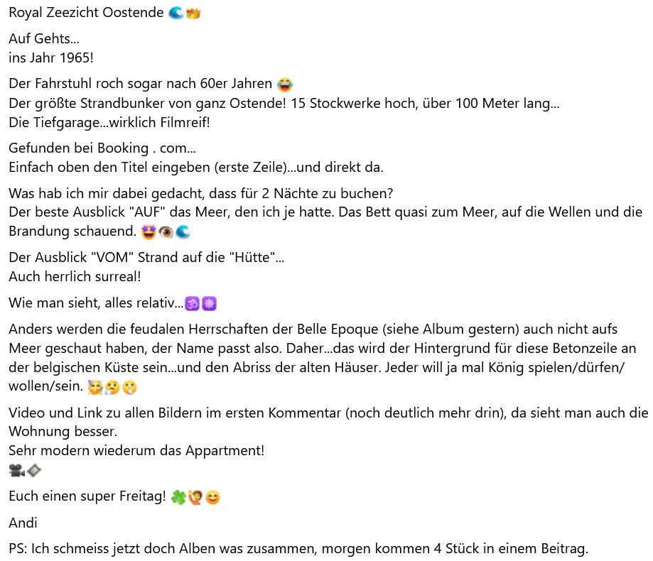 Royal Zeezicht Oostende Auf Gehts...ins Jahr 1965! Der Fahrstuhl roch sogar nach 60er Jahren Der größte Strandbunker von ganz Ostende! 15 Stockwerke hoch, über 100 Meter lang...Die Tiefgarage...wirklich Filmreif!Gefunden bei Booking . com...Einfach oben den Titel eingeben (erste Zeile)...und direkt da.Was hab ich mir dabei gedacht, dass für 2 Nächte zu buchen?Der beste Ausblick "AUF" das Meer, den ich je hatte. Das Bett quasi zum Meer, auf die Wellen und die Brandung schauend. Der Ausblick "VOM" Strand auf die "Hütte"...Auch herrlich surreal!Wie man sieht, alles relativ...Anders werden die feudalen Herrschaften der Belle Epoque (siehe Album gestern) auch nicht aufs Meer geschaut haben, der Name passt also. Daher...das wird der Hintergrund für diese Betonzeile an der belgischen Küste sein...und den Abriss der alten Häuser. Jeder will ja mal König spielen/dürfen/wollen/sein. Video und Link zu allen Bildern im ersten Kommentar (noch deutlich mehr drin), da sieht man auch die Wohnung besser.Sehr modern wiederum das Appartment!Euch einen super Freitag! Andi