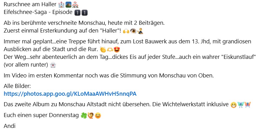 Rurschnee am Haller Eifelschnee-Saga - Episode Ab ins berühmte verschneite Monschau, heute mit 2 Beiträgen.Zuerst einmal Ersterkundung auf den "Haller"! Immer mal geplant...eine Treppe führt hinauf, zum Lost Bauwerk aus dem 13. Jhd, mit grandiosen Ausblicken auf die Stadt und die Rur. Der Weg...sehr abenteuerlich an dem Tag...dickes Eis auf jeder Stufe...auch ein wahrer "Eiskunstlauf" (vor allem runter) Im Video im ersten Kommentar noch was die Stimmung von Monschau von Oben.Alle Bilder:https://photos.app.goo.gl/KLoMaaAWHvH5nnqPADas zweite Album zu Monschau Altstadt nicht übersehen. Die Wichtelwerkstatt inklusive
