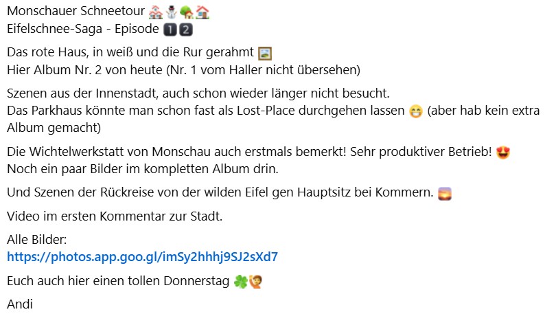 Monschauer Schneetour Eifelschnee-Saga - Episode Das rote Haus, in weiß und die Rur gerahmt Hier Album Nr. 2 von heute (Nr. 1 vom Haller nicht übersehen)Szenen aus der Innenstadt, auch schon wieder länger nicht besucht.Das Parkhaus könnte man schon fast als Lost-Place durchgehen lassen (aber hab kein extra Album gemacht)Die Wichtelwerkstatt von Monschau auch erstmals bemerkt! Sehr produktiver Betrieb! Noch ein paar Bilder im kompletten Album drin.Und Szenen der Rückreise von der wilden Eifel gen Hauptsitz bei Kommern. Video im ersten Kommentar zur Stadt.