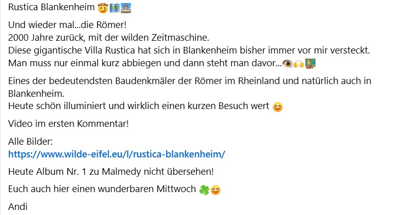 Rustica Blankenheim Und wieder mal...die Römer! 2000 Jahre zurück, mit der wilden Zeitmaschine.Diese gigantische Villa Rustica hat sich in Blankenheim bisher immer vor mir versteckt. Man muss nur einmal kurz abbiegen und dann steht man davor...Eines der bedeutendsten Baudenkmäler der Römer im Rheinland und natürlich auch in Blankenheim.Heute schön illuminiert und wirklich einen kurzen Besuch wert