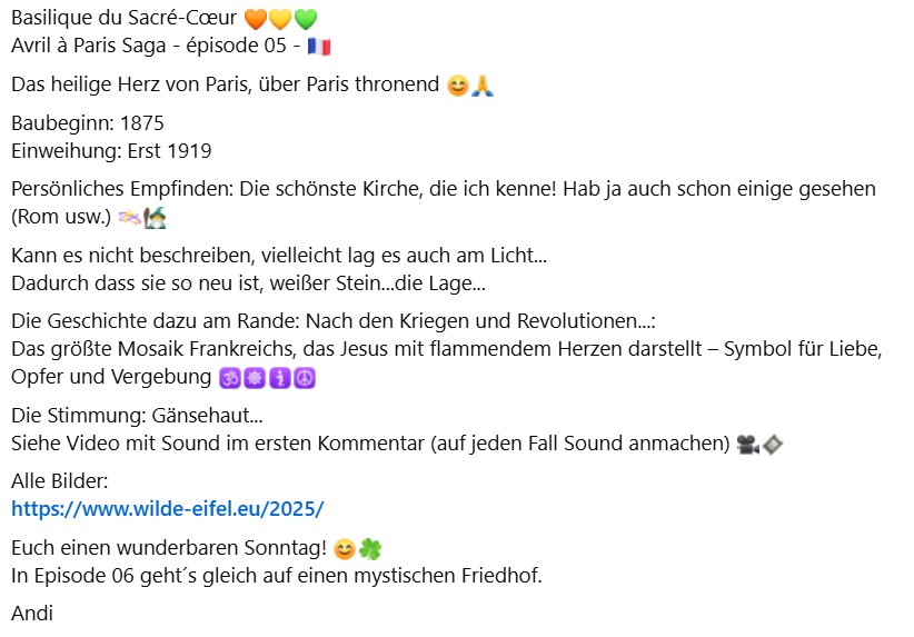 Basilique du Sacré-Cœur Avril à Paris Saga - épisode 05 - Das heilige Herz von Paris, über Paris thronend Baubeginn: 1875Einweihung: Erst 1919Persönliches Empfinden: Die schönste Kirche, die ich kenne! Hab ja auch schon einige gesehen (Rom usw.) Kann es nicht beschreiben, vielleicht lag es auch am Licht...Dadurch dass sie so neu ist, weißer Stein...die Lage...Die Geschichte dazu am Rande: Nach den Kriegen und Revolutionen...:Das größte Mosaik Frankreichs, das Jesus mit flammendem Herzen darstellt – Symbol für Liebe, Opfer und Vergebung Die Stimmung: Gänsehaut...Siehe Video mit Sound im ersten Kommentar (auf jeden Fall Sound anmachen)
