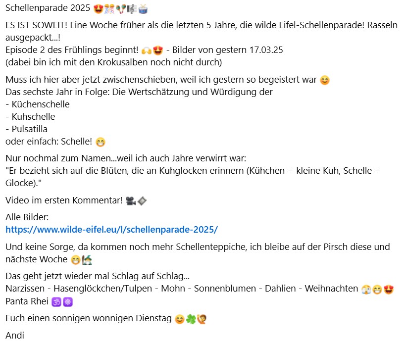 Schellenparade 2025 ES IST SOWEIT! Eine Woche früher als die letzten 5 Jahre, die wilde Eifel-Schellenparade! Rasseln ausgepackt...!Episode 2 des Frühlings beginnt! - Bilder von gestern 17.03.25(dabei bin ich mit den Krokusalben noch nicht durch)Muss ich hier aber jetzt zwischenschieben, weil ich gestern so begeistert war Das sechste Jahr in Folge: Die Wertschätzung und Würdigung der - Küchenschelle- Kuhschelle- Pulsatillaoder einfach: Schelle! Nur nochmal zum Namen...weil ich auch Jahre verwirrt war:"Er bezieht sich auf die Blüten, die an Kuhglocken erinnern (Kühchen = kleine Kuh, Schelle = Glocke)."Video im ersten Kommentar! Alle Bilder:https://www.wilde-eifel.eu/l/schellenparade-2025/Und keine Sorge, da kommen noch mehr Schellenteppiche, ich bleibe auf der Pirsch diese und nächste Woche Das geht jetzt wieder mal Schlag auf Schlag...Narzissen - Hasenglöckchen/Tulpen - Mohn - Sonnenblumen - Dahlien - Weihnachten Panta Rhei Euch einen sonnigen wonnigen Dienstag Andi
