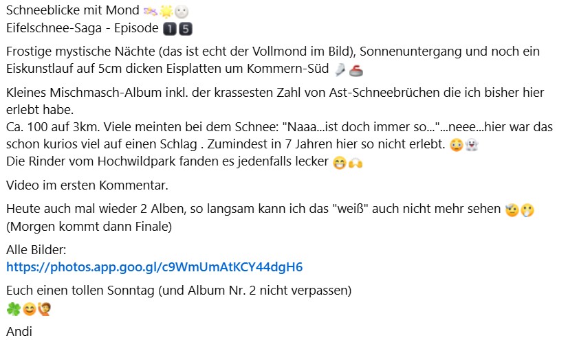 Schneeblicke mit Mond Eifelschnee-Saga - Episode Frostige mystische Nächte (das ist echt der Vollmond im Bild), Sonnenuntergang und noch ein Eiskunstlauf auf 5cm dicken Eisplatten um Kommern-Süd Kleines Mischmasch-Album inkl. der krassesten Zahl von Ast-Schneebrüchen die ich bisher hier erlebt habe. Ca. 100 auf 3km. Viele meinten bei dem Schnee: "Naaa...ist doch immer so..."...neee...hier war das schon kurios viel auf einen Schlag . Zumindest in 7 Jahren hier so nicht erlebt. Die Rinder vom Hochwildpark fanden es jedenfalls lecker Video im ersten Kommentar. Heute auch mal wieder 2 Alben, so langsam kann ich das "weiß" auch nicht mehr sehen (Morgen kommt dann Finale)