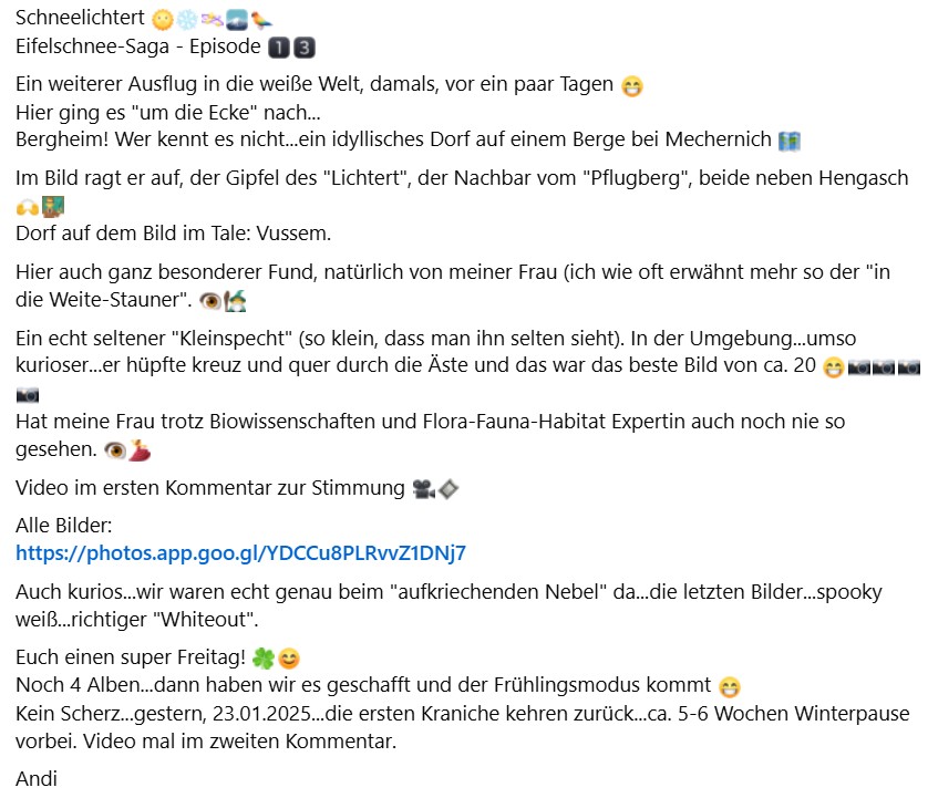 Schneelichtert Eifelschnee-Saga - Episode Ein weiterer Ausflug in die weiße Welt, damals, vor ein paar Tagen Hier ging es "um die Ecke" nach...Bergheim! Wer kennt es nicht...ein idyllisches Dorf auf einem Berge bei Mechernich Im Bild ragt er auf, der Gipfel des "Lichtert", der Nachbar vom "Pflugberg", beide neben Hengasch Dorf auf dem Bild im Tale: Vussem.Hier auch ganz besonderer Fund, natürlich von meiner Frau (ich wie oft erwähnt mehr so der "in die Weite-Stauner". Ein echt seltener "Kleinspecht" (so klein, dass man ihn selten sieht). In der Umgebung...umso kurioser...er hüpfte kreuz und quer durch die Äste und das war das beste Bild von ca. 20 Hat meine Frau trotz Biowissenschaften und Flora-Fauna-Habitat Expertin auch noch nie so gesehen. Video im ersten Kommentar zur Stimmung Alle Bilder:https://photos.app.goo.gl/YDCCu8PLRvvZ1DNj7Auch kurios...wir waren echt genau beim "aufkriechenden Nebel" da...die letzten Bilder...spooky weiß...richtiger "Whiteout".Euch einen super Freitag! Noch 4 Alben...dann haben wir es geschafft und der Frühlingsmodus kommt Kein Scherz...gestern, 23.01.2025...die ersten Kraniche kehren zurück...ca. 5-6 Wochen Winterpause vorbei. Video mal im zweiten Kommentar.Andi