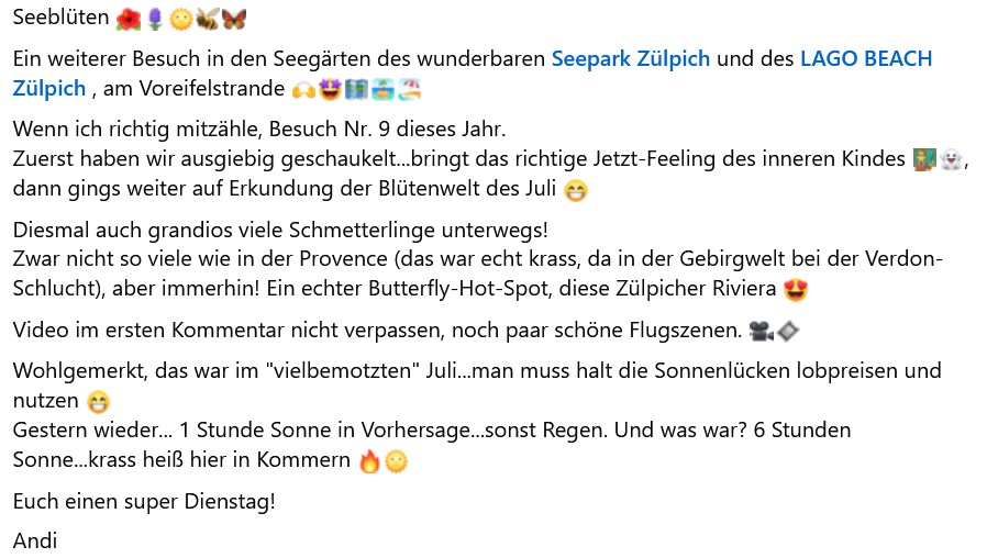Seeblüten Ein weiterer Besuch in den Seegärten des wunderbaren Seepark Zülpich und des LAGO BEACH Zülpich , am Voreifelstrande Wenn ich richtig mitzähle, Besuch Nr. 9 dieses Jahr.Zuerst haben wir ausgiebig geschaukelt...bringt das richtige Jetzt-Feeling des inneren Kindes , dann gings weiter auf Erkundung der Blütenwelt des Juli Diesmal auch grandios viele Schmetterlinge unterwegs! Zwar nicht so viele wie in der Provence (das war echt krass, da in der Gebirgwelt bei der Verdon-Schlucht), aber immerhin! Ein echter Butterfly-Hot-Spot, diese Zülpicher Riviera Video im ersten Kommentar nicht verpassen, noch paar schöne Flugszenen. Wohlgemerkt, das war im "vielbemotzten" Juli...man muss halt die Sonnenlücken lobpreisen und nutzen Gestern wieder... 1 Stunde Sonne in Vorhersage...sonst Regen. Und was war? 6 Stunden Sonne...krass heiß hier in Kommern Euch einen super Dienstag!Andi