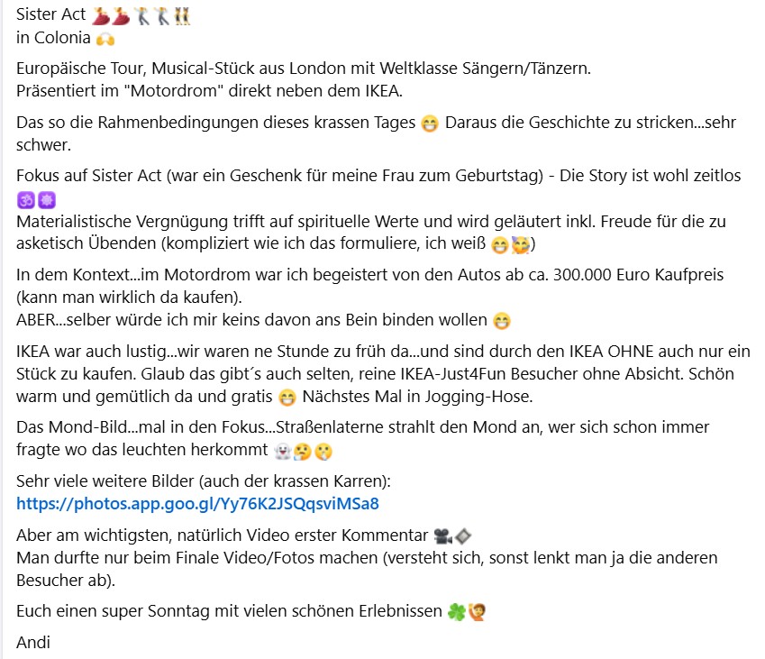 Sister Act in Colonia Europäische Tour, Musical-Stück aus London mit Weltklasse Sängern/Tänzern. Präsentiert im "Motordrom" direkt neben dem IKEA.Das so die Rahmenbedingungen dieses krassen Tages Daraus die Geschichte zu stricken...sehr schwer.Fokus auf Sister Act (war ein Geschenk für meine Frau zum Geburtstag) - Die Story ist wohl zeitlos Materialistische Vergnügung trifft auf spirituelle Werte und wird geläutert inkl. Freude für die zu asketisch Übenden (kompliziert wie ich das formuliere, ich weiß )In dem Kontext...im Motordrom war ich begeistert von den Autos ab ca. 300.000 Euro Kaufpreis (kann man wirklich da kaufen).ABER...selber würde ich mir keins davon ans Bein binden wollen IKEA war auch lustig...wir waren ne Stunde zu früh da...und sind durch den IKEA OHNE auch nur ein Stück zu kaufen. Glaub das gibt´s auch selten, reine IKEA-Just4Fun Besucher ohne Absicht. Schön warm und gemütlich da und gratis Nächstes Mal in Jogging-Hose.Das Mond-Bild...mal in den Fokus...Straßenlaterne strahlt den Mond an, wer sich schon immer fragte wo das leuchten herkommt