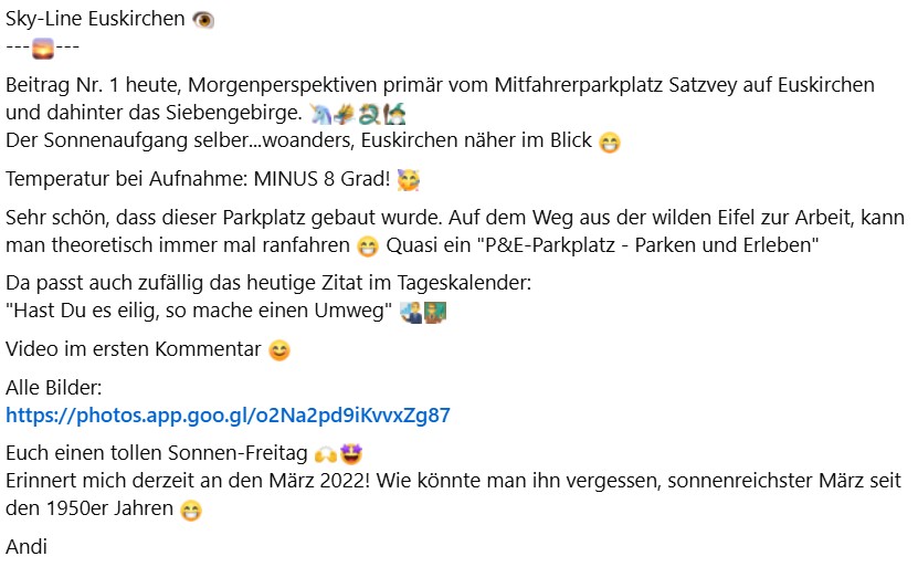 Sky-Line Euskirchen ------Beitrag Nr. 1 heute, Morgenperspektiven primär vom Mitfahrerparkplatz Satzvey auf Euskirchen und dahinter das Siebengebirge. Der Sonnenaufgang selber...woanders, Euskirchen näher im Blick Temperatur bei Aufnahme: MINUS 8 Grad! Sehr schön, dass dieser Parkplatz gebaut wurde. Auf dem Weg aus der wilden Eifel zur Arbeit, kann man theoretisch immer mal ranfahren Quasi ein "P&E-Parkplatz - Parken und Erleben"Da passt auch zufällig das heutige Zitat im Tageskalender:"Hast Du es eilig, so mache einen Umweg" Video im ersten Kommentar Alle Bilder:https://photos.app.goo.gl/o2Na2pd9iKvvxZg87Euch einen tollen Sonnen-Freitag Erinnert mich derzeit an den März 2022! Wie könnte man ihn vergessen, sonnenreichster März seit den 1950er Jahren Andi