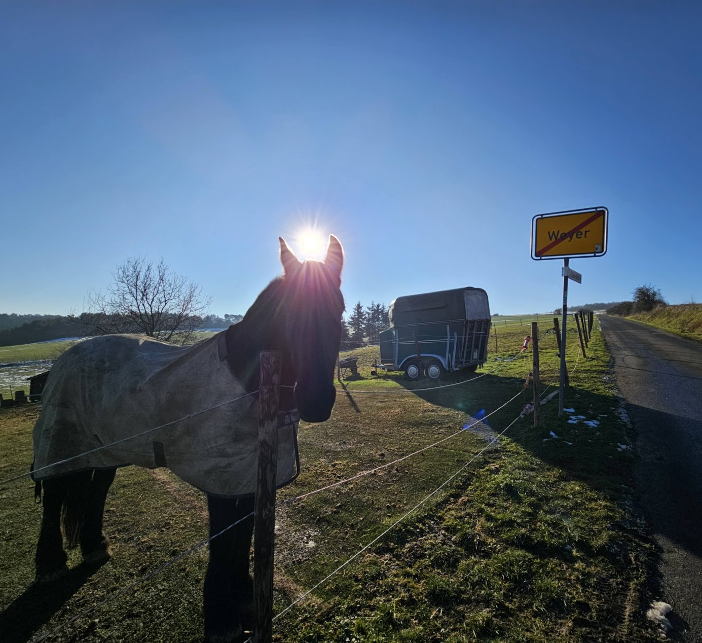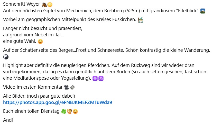 Sonnenritt Weyer Auf dem höchsten Gipfel von Mechernich, dem Brehberg (525m) mit grandiosem "Eifelblick" Vorbei am geographischen Mittelpunkt des Kreises Euskirchen. Länger nicht besucht und präsentiert,aufgrund vom Nebel im Tal...eine gute Wahl. Auf der Schattenseite des Berges...Frost und Schneereste. Schön kontrastig die kleine Wanderung. Highlight aber definitiv die neugierigen Pferdchen. Auf dem Rückweg sind wir wieder dran vorbeigekommen, da lag es dann gemütlich auf dem Boden (so auch selten gesehen, fast schon eine Meditationspose oder Yogastellung).