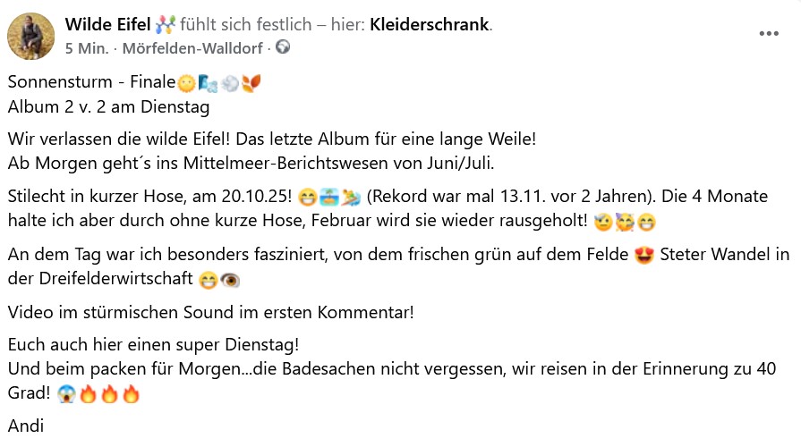 Der Einstieg allein – "Wir verlassen die wilde Eifel! Das letzte Album für eine lange Weile!" – klingt wie das Finale einer Netflix-Serie über Jahreszeiten. Man spürt richtig, dass du dich selbst beim Schreiben augenzwinkernd verneigst, bevor der Abspann läuft. 🎬