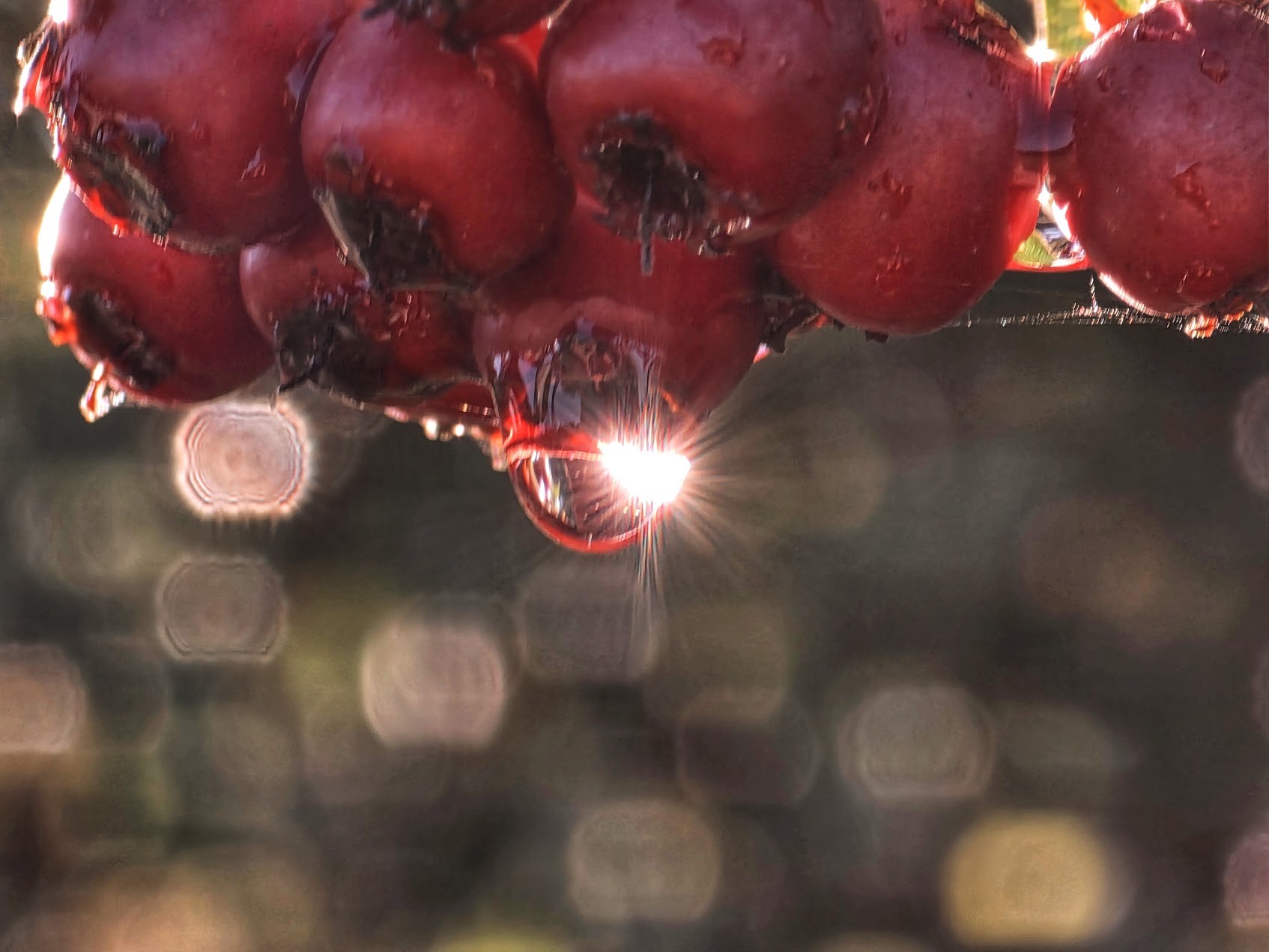 Das erste Foto ist magisch – diese Lichtreflexion im Tropfen, das gebrochene Sonnenlicht, das fast wie eine kleine Galaxie wirkt. Du hast genau den Moment erwischt, in dem Physik und Poesie kurz dieselbe Sprache sprechen.